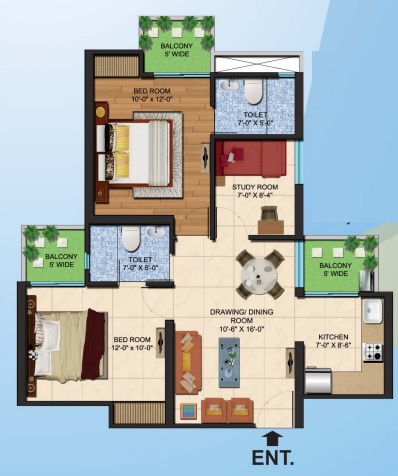 2 BHK + Study + 2 Washrooms