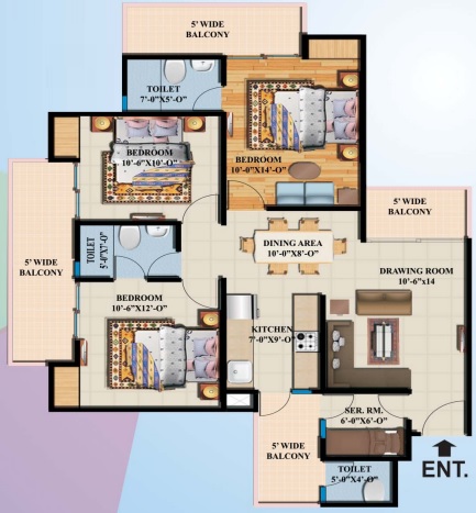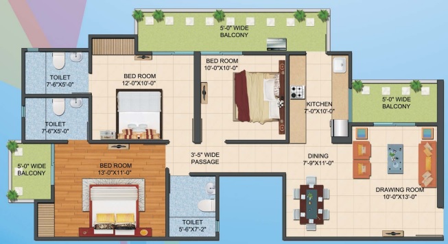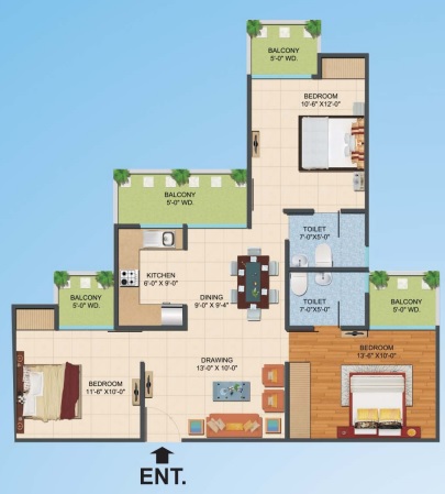 3 BHK + 3 Washrooms