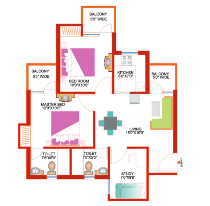2 BHK + Study + 2 Washrooms