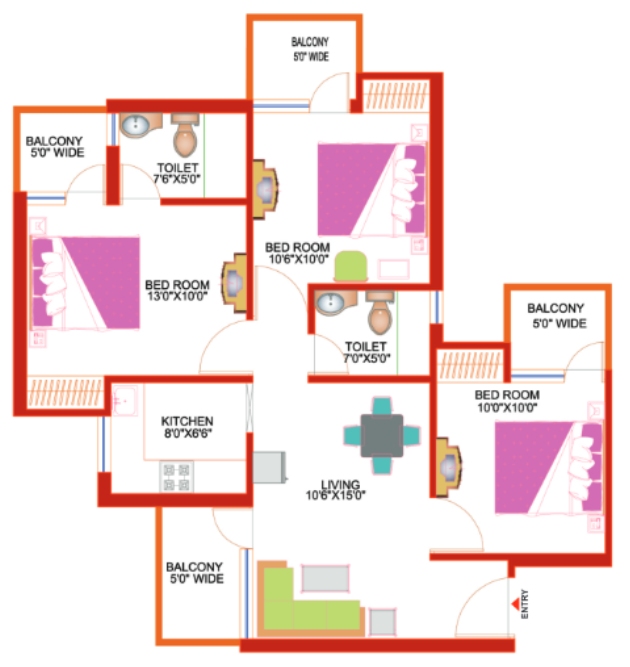 3 BHK + 2 Washrooms