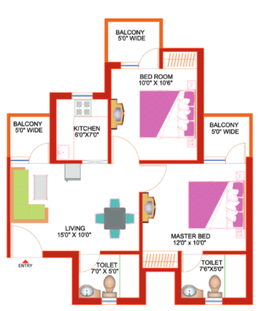 2 BHK + 2 Washrooms
