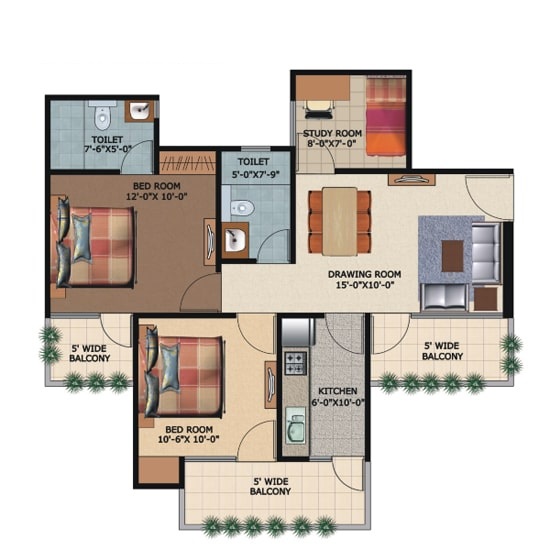 2 BHK + Study + 2 Washrooms