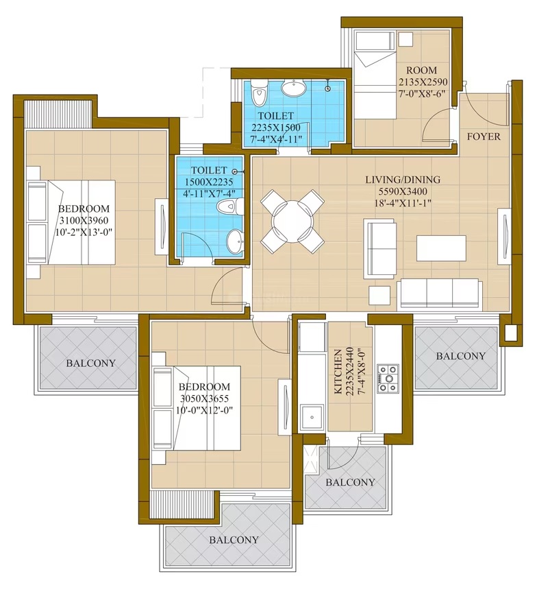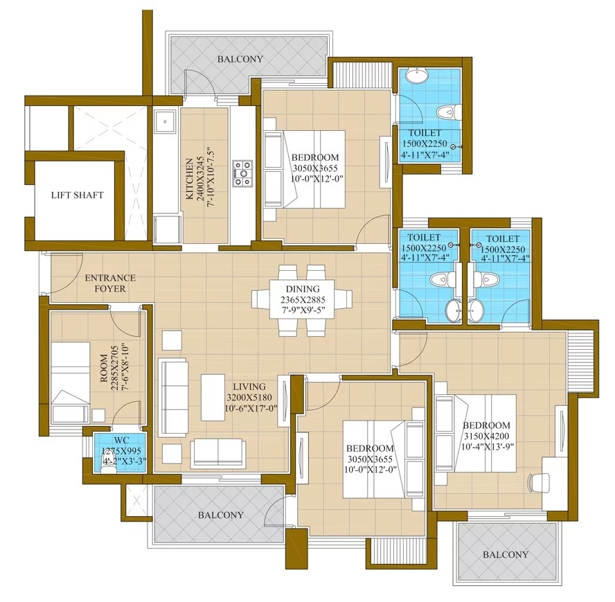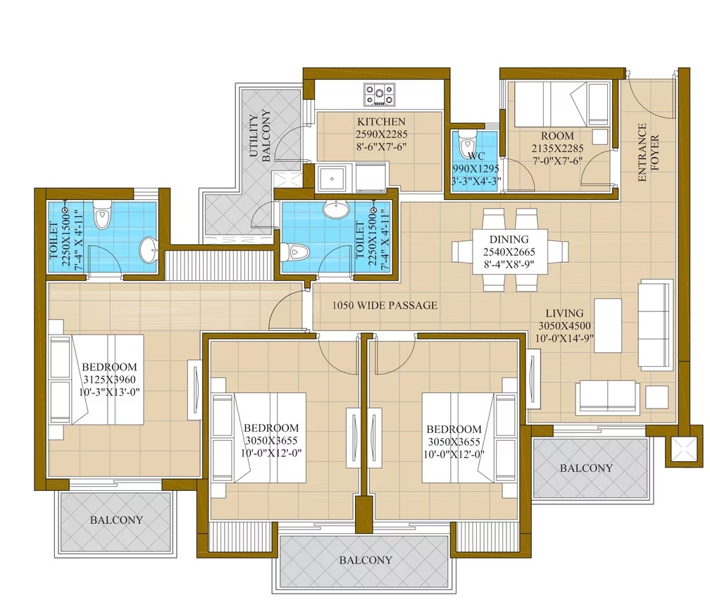 3 BHK + 3 Washrooms