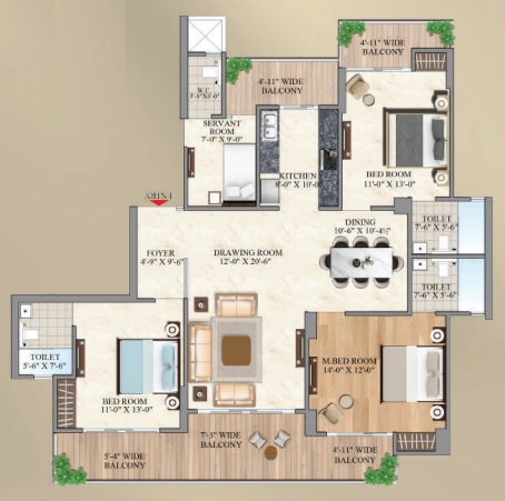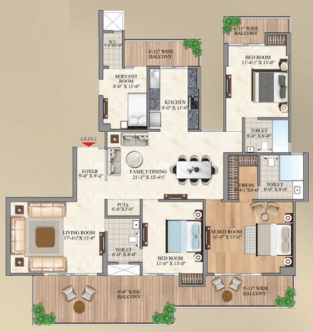 3 BHK + Servernt + 4 Washrooms