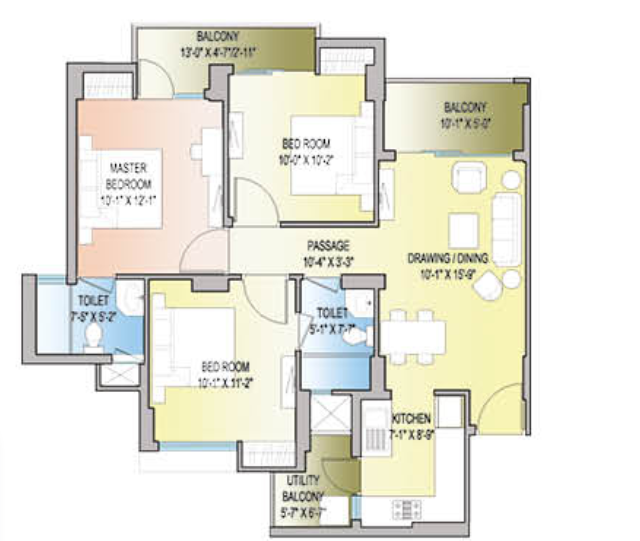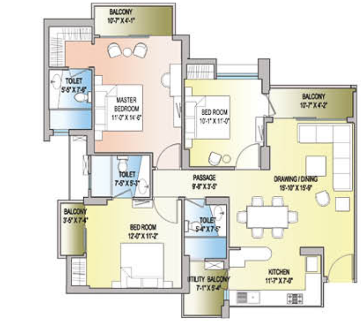 3 BHK + 3 Washrooms