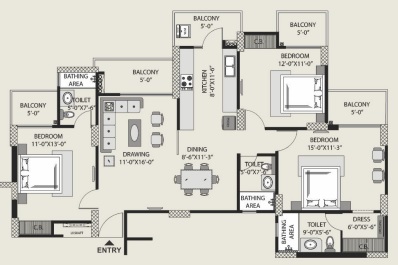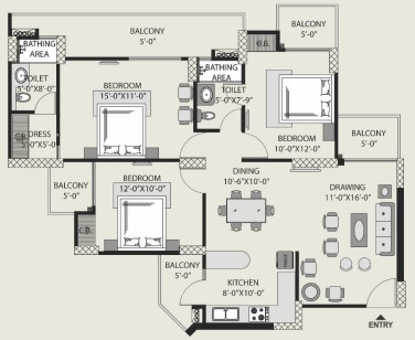 3 BHK + 3 Washrooms