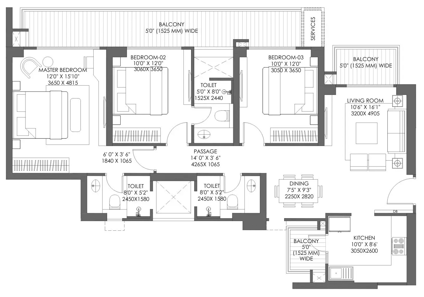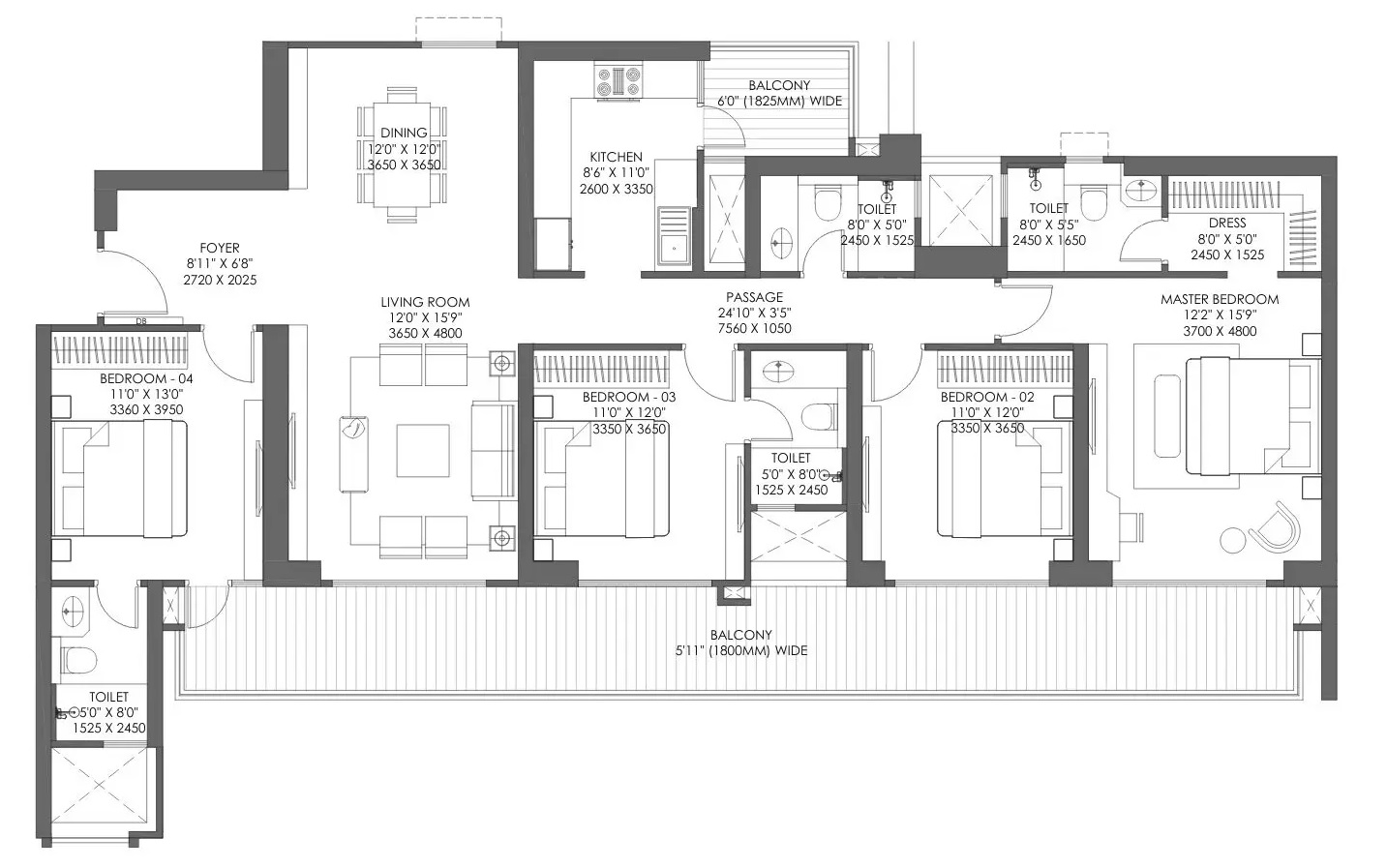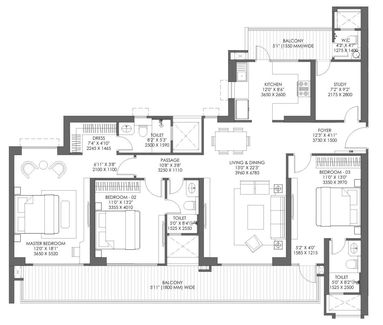 Flat Sizes - ( 1754 - 2576 ) sqft