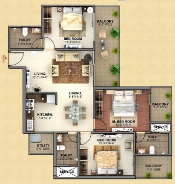 3 BHK + 3 Washrooms