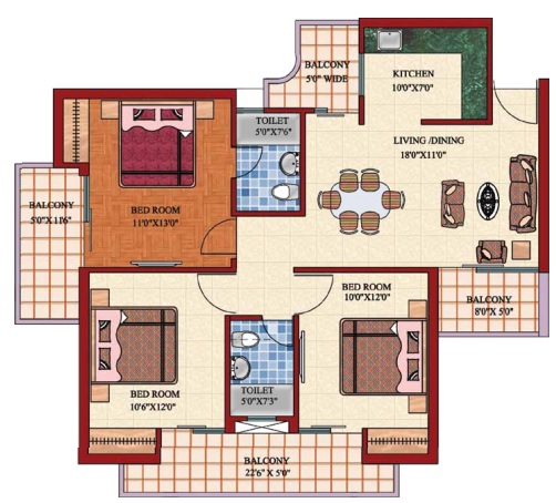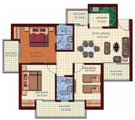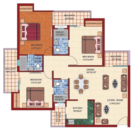 3 BHK + 3 Washrooms