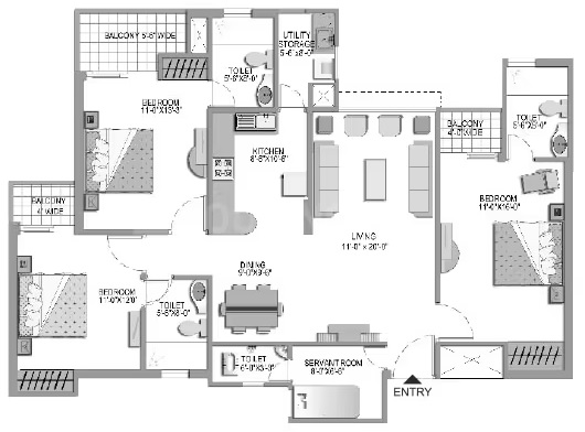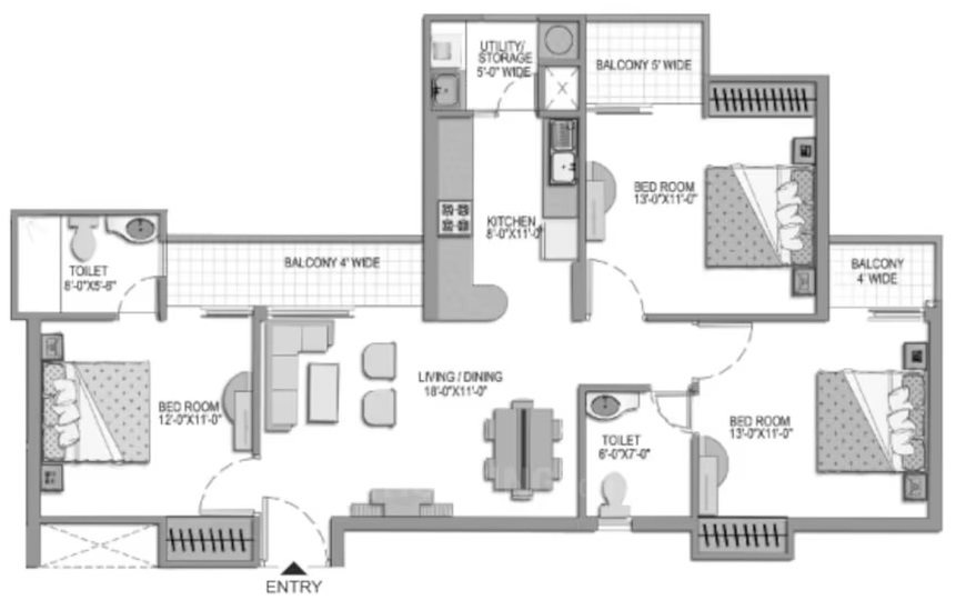 3 BHK + 3 Washrooms