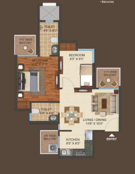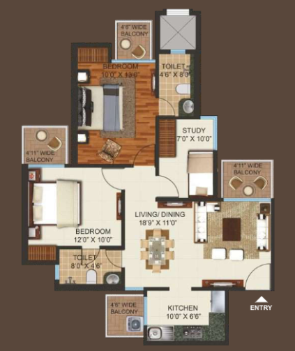 2 BHK + Study + 2 Washrooms