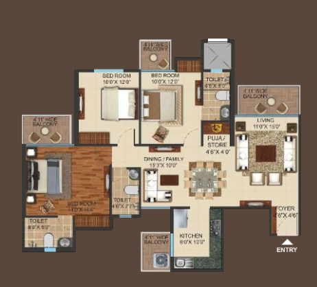 3 BHK + Store + 3 Washrooms