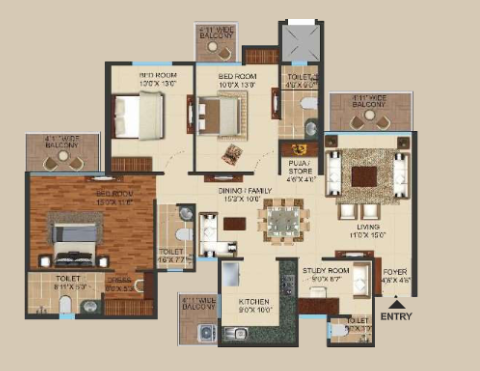 3 BHK + Study + 4 Washrooms