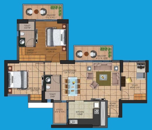 2 BHK + Study + 2 Washrooms