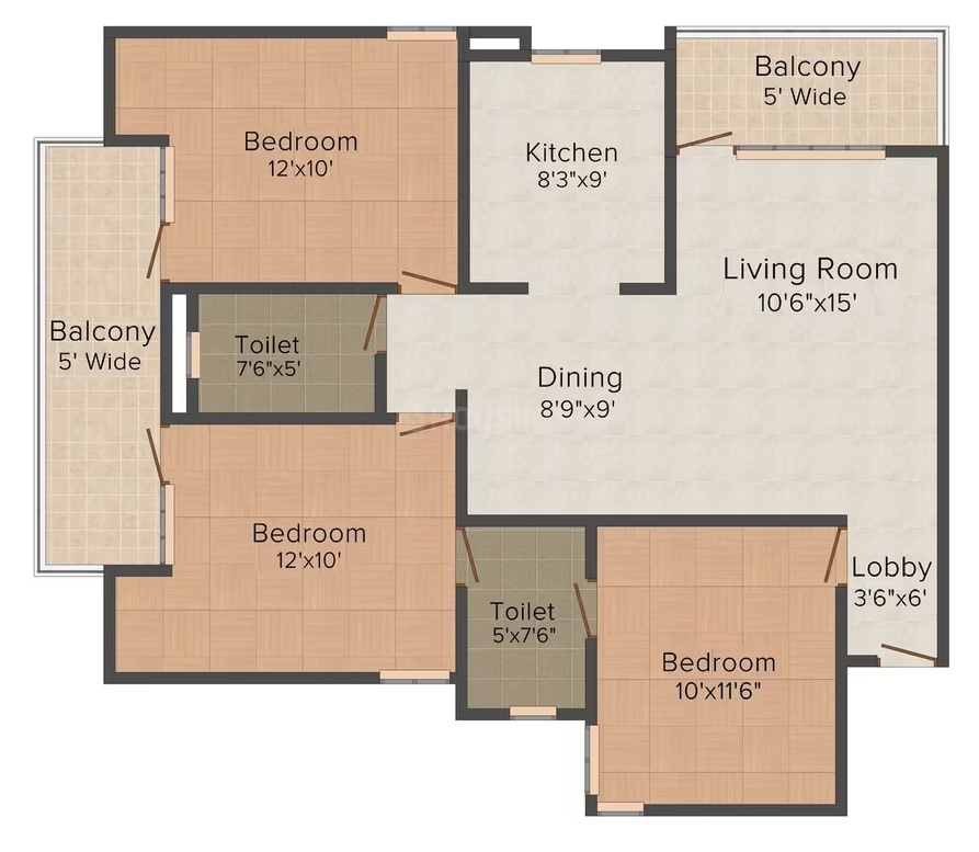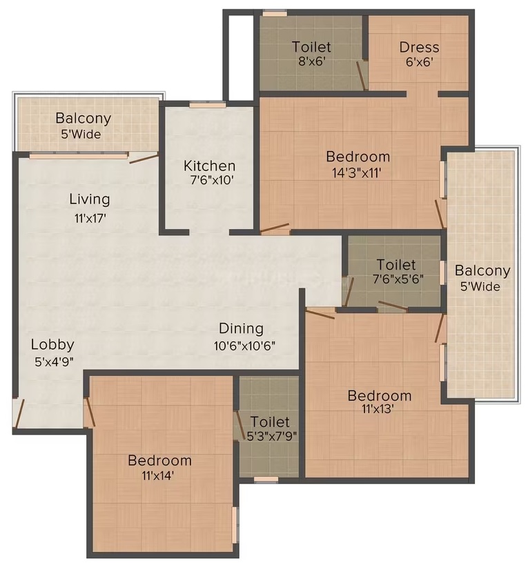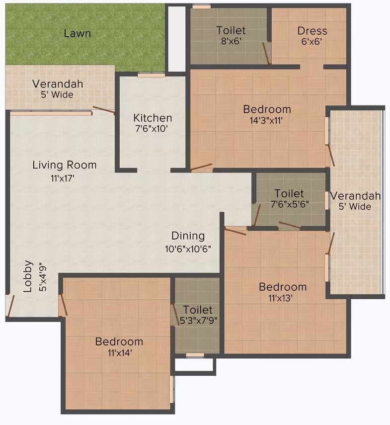 3 BHK + Study + 3 Washrooms