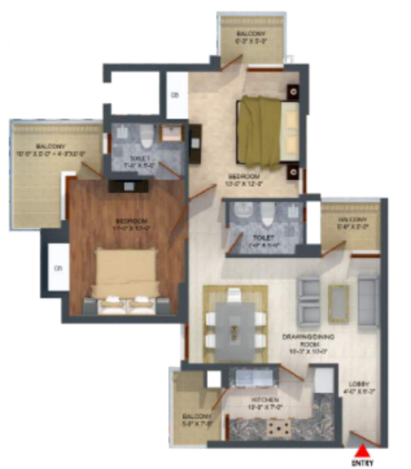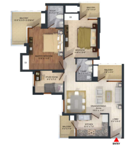 2 BHK + Study + 2 Washrooms