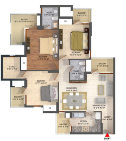3 BHK + Store + 2 Washrooms