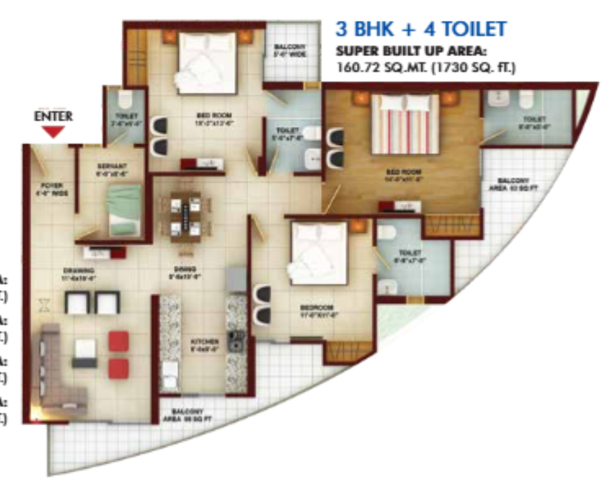3 BHK + Servernt + 4 Washrooms
