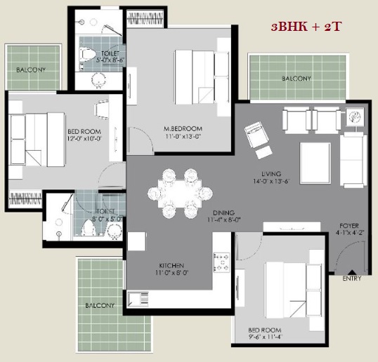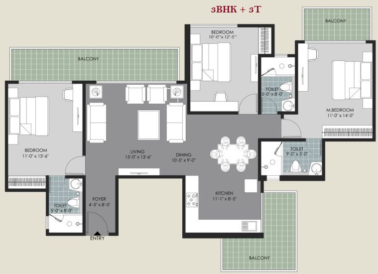 3 BHK + 3 Washrooms