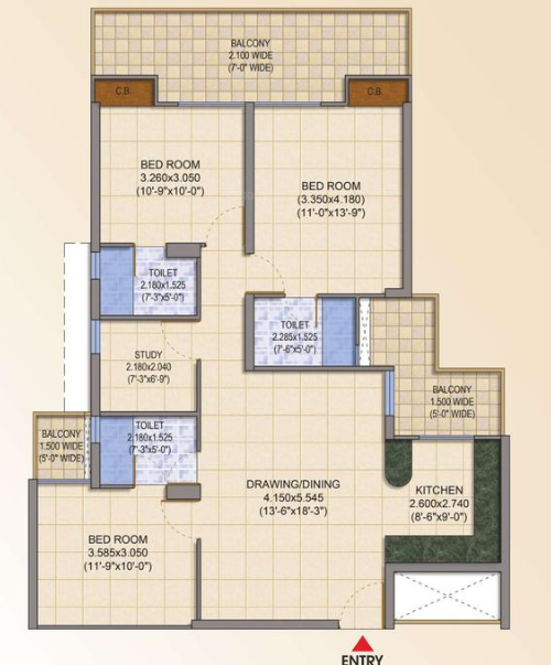 3 BHK + Study + 3 Washrooms