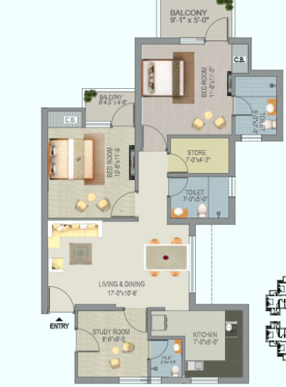 2 BHK + Study + 3 Washrooms