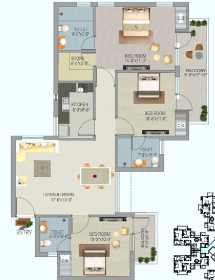 3 BHK + Store + 4 Washrooms