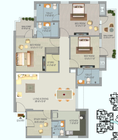 3 BHK + Study + 3 Washrooms