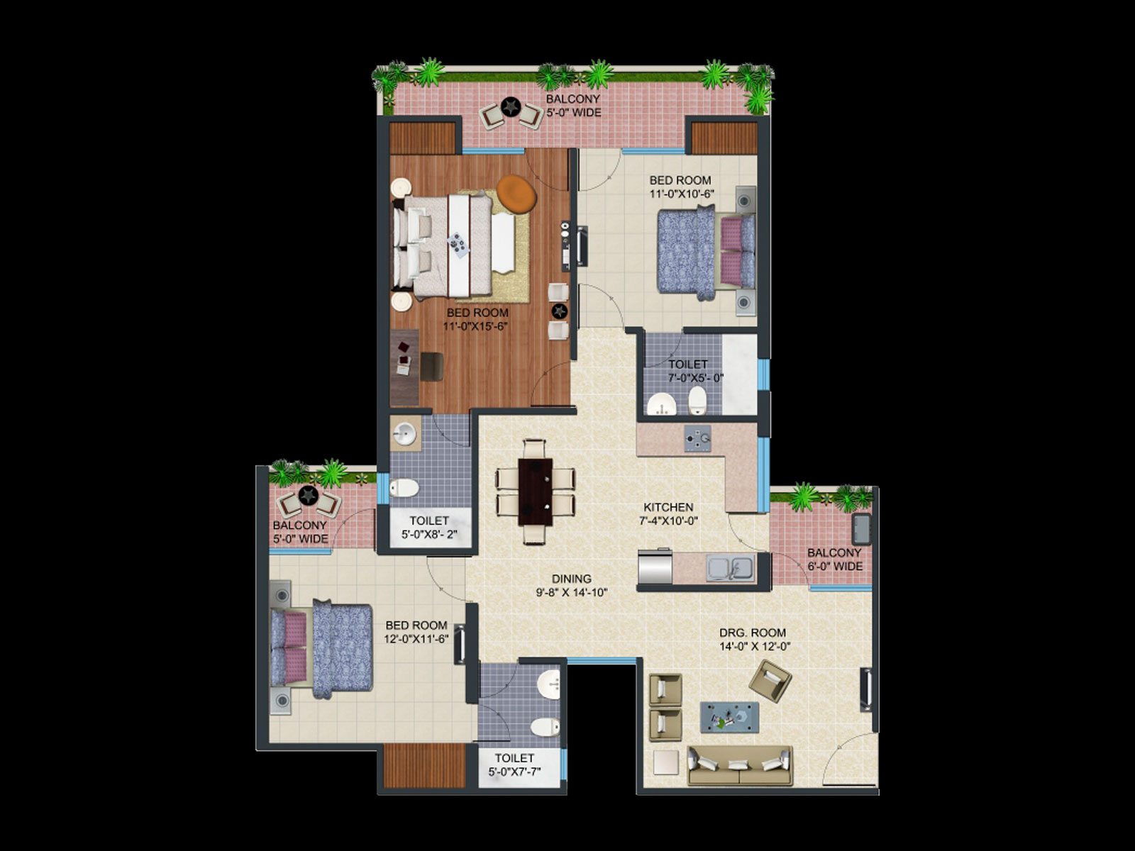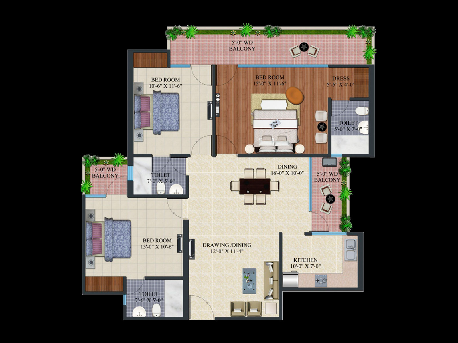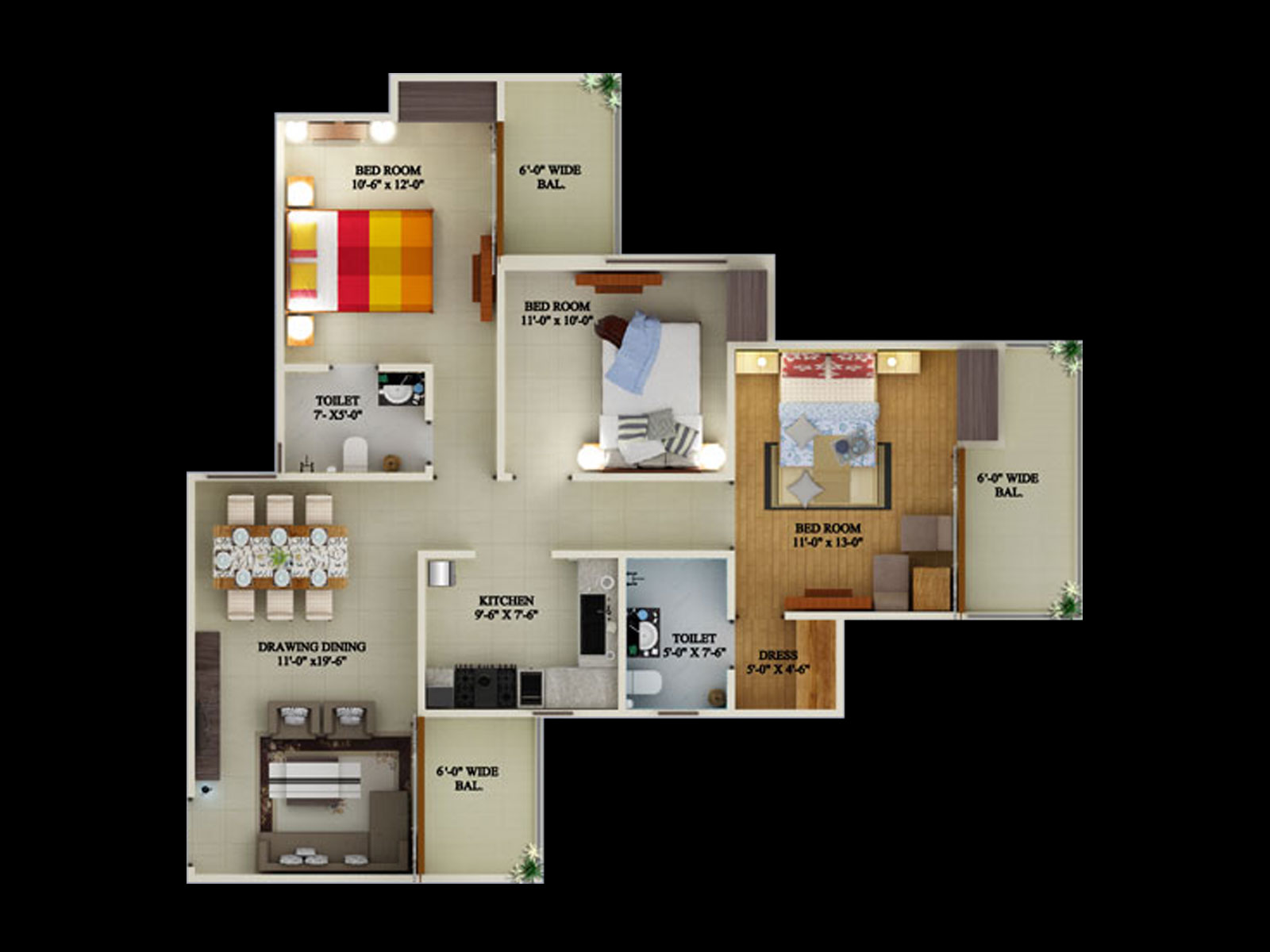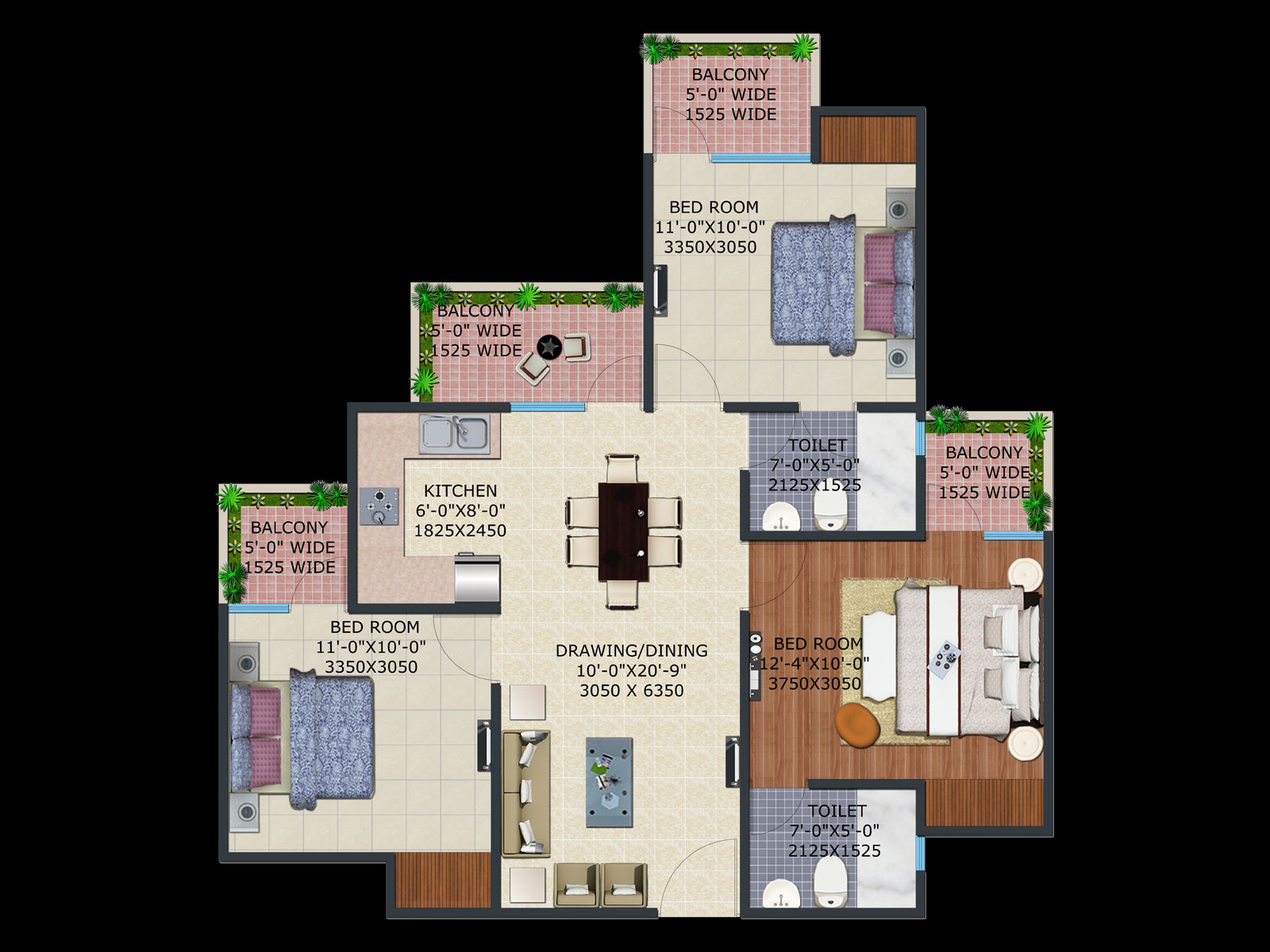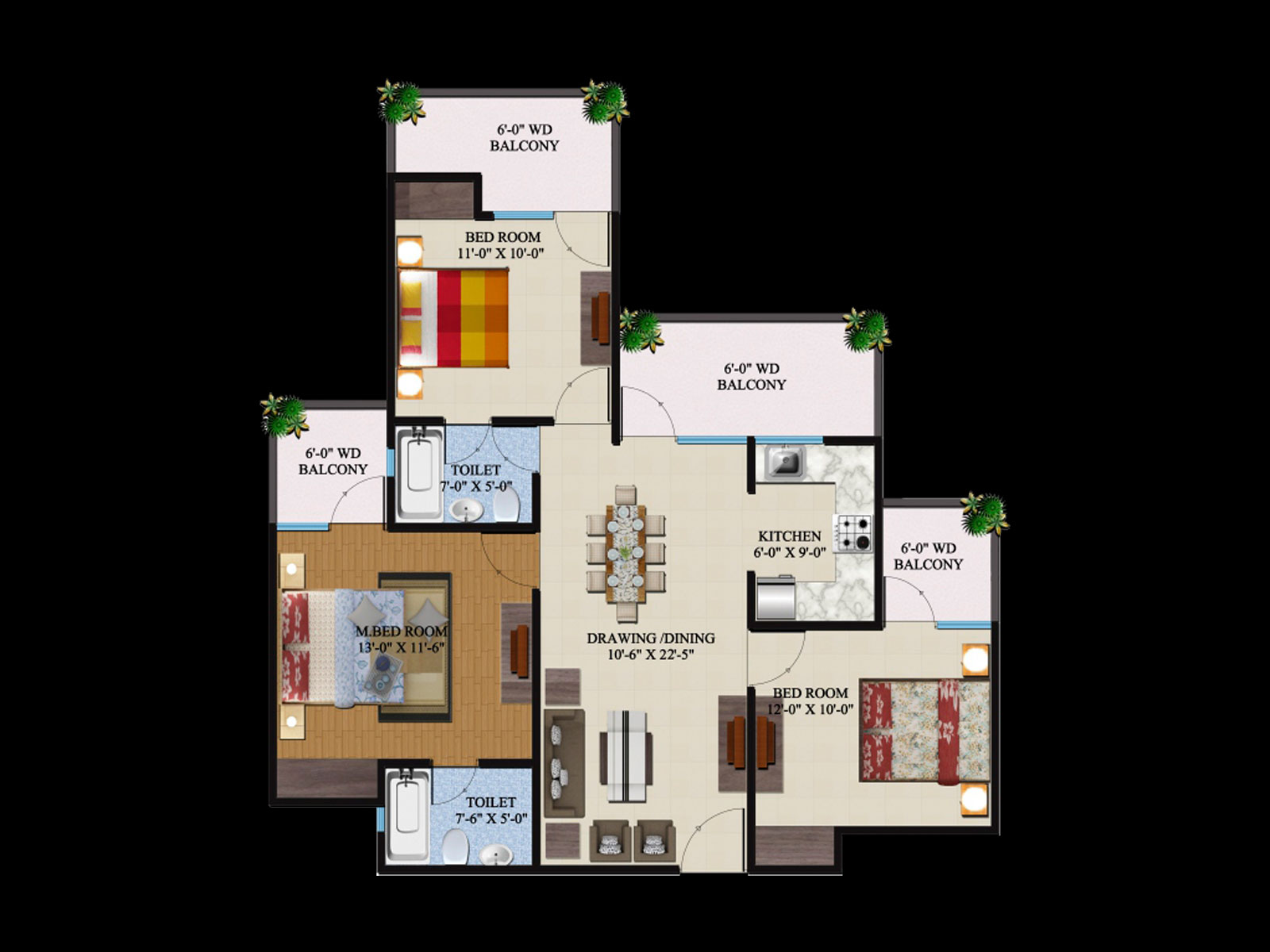 3 BHK + 3 Washrooms