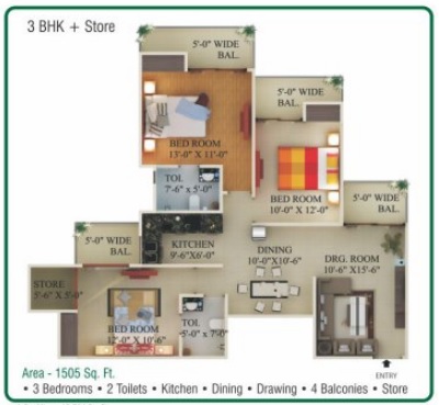 3 BHK + Store + 2 Washrooms