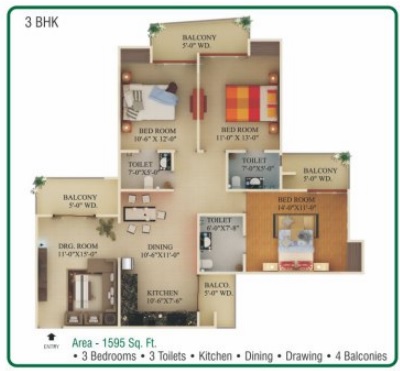 3 BHK + 3 Washrooms