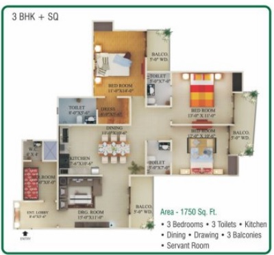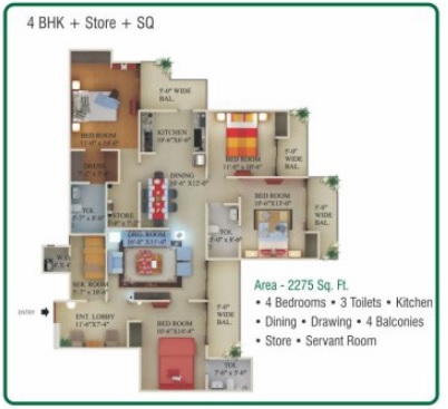 3 BHK + Servernt + 4 Washrooms