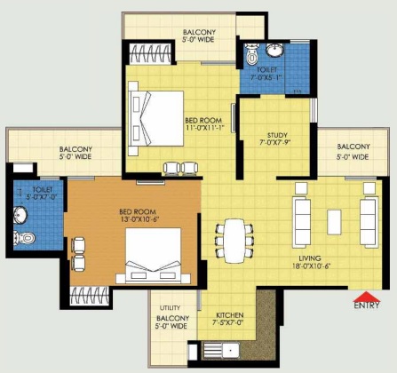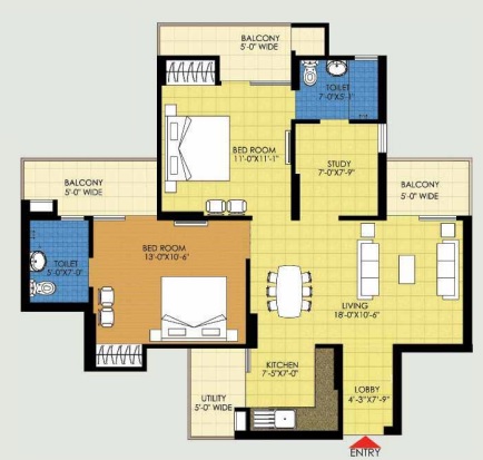2 BHK + Study + 2 Washrooms