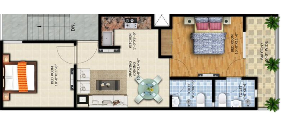 2 BHK + 2 Washrooms